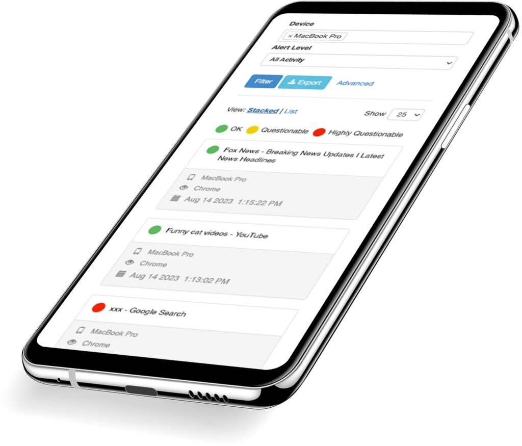 - Snadné monitorování použití: Canopy monitoruje veškeré procházení internetu (včetně obrázků, textu, videí a URL), všechny fotografie pořízené nebo stažené na Androidu a většinu fotografií pořízených nebo stažených na iPhonu. Sleduje také používané aplikace a dobu jejich používání, což lze vidět ve zprávě o čase stráveném u obrazovky.