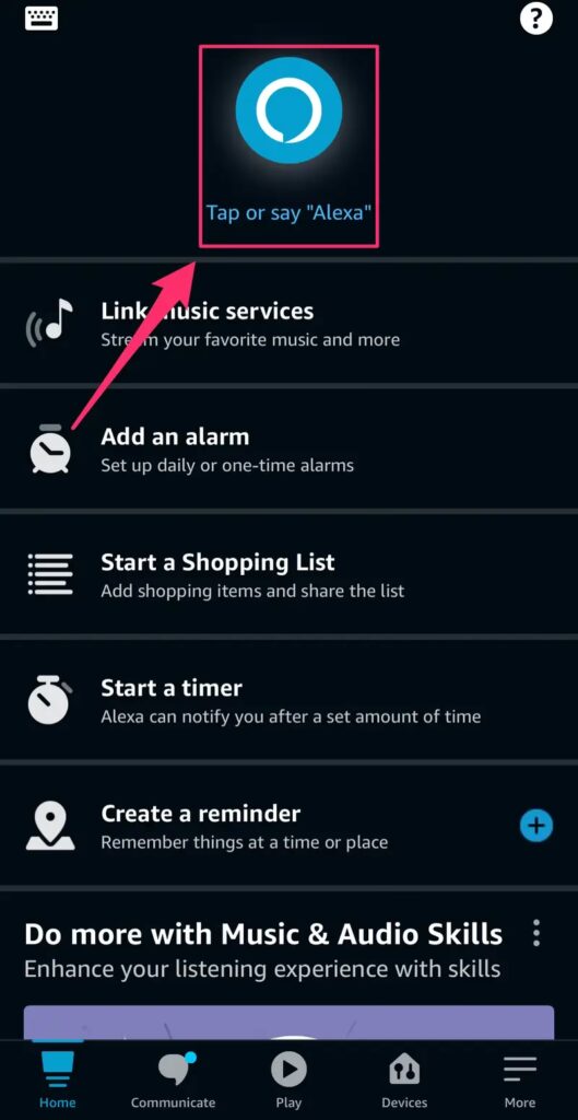 - Z domovské obrazovky aplikace Alexa klepněte na ikonu klávesnice, která se nachází v levém horním rohu obrazovky.