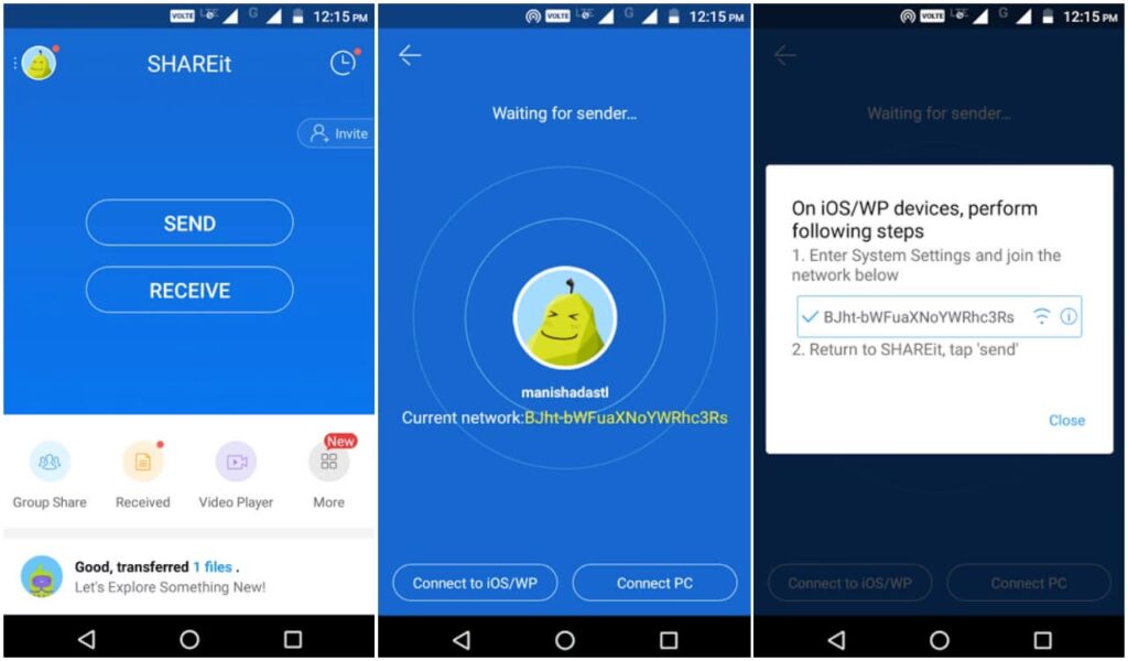 - Příjem na iPhonu: Otevřete SHAREit na iPhonu a klepněte na „Přijmout“. Počkejte, až se soubory přenesou.