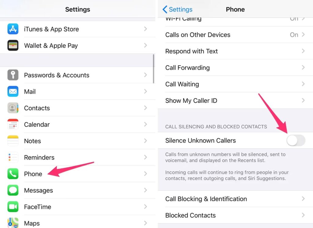 - Sjeďte ještě níže a najděte možnost Utišit neznámé volající (Silence Unknown Callers).