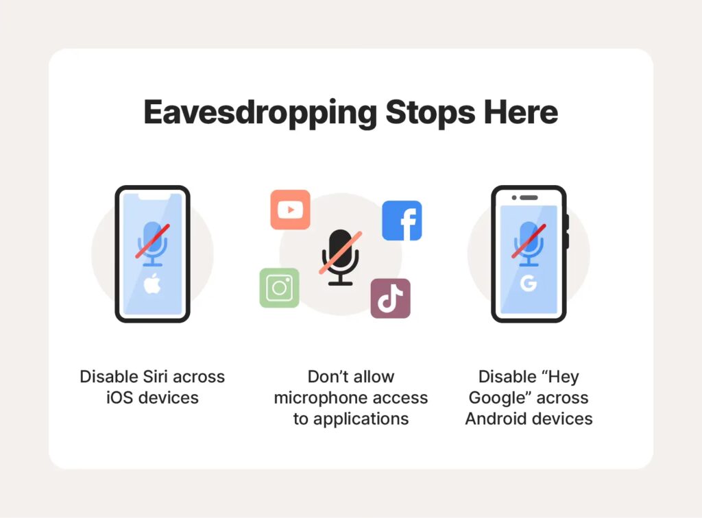 Většina telefonů vás „poslouchá“ za účelem povolení hlasových asistentů, jako je Siri, kteří jsou neustále v pohotovosti pro hlasové povely jako „Hey Siri“. Toto pasivní poslouchání zajišťuje, že jsou virtuální asistenti připraveni vám pomoci s úkolem, když je to potřeba. Nicméně, v závislosti na vývojáři, mohou aplikace hlasových technologií také používat data z vašich konverzací k doporučování reklam a obsahu. Například Google používá konverzační data z Asistenta k personalizaci reklam a doporučení obsahu. Jiní, jako je Siri od Applu, tvrdí, že konverzační data nepoužívají k vytváření marketingových profilů nebo kurátorství reklam.