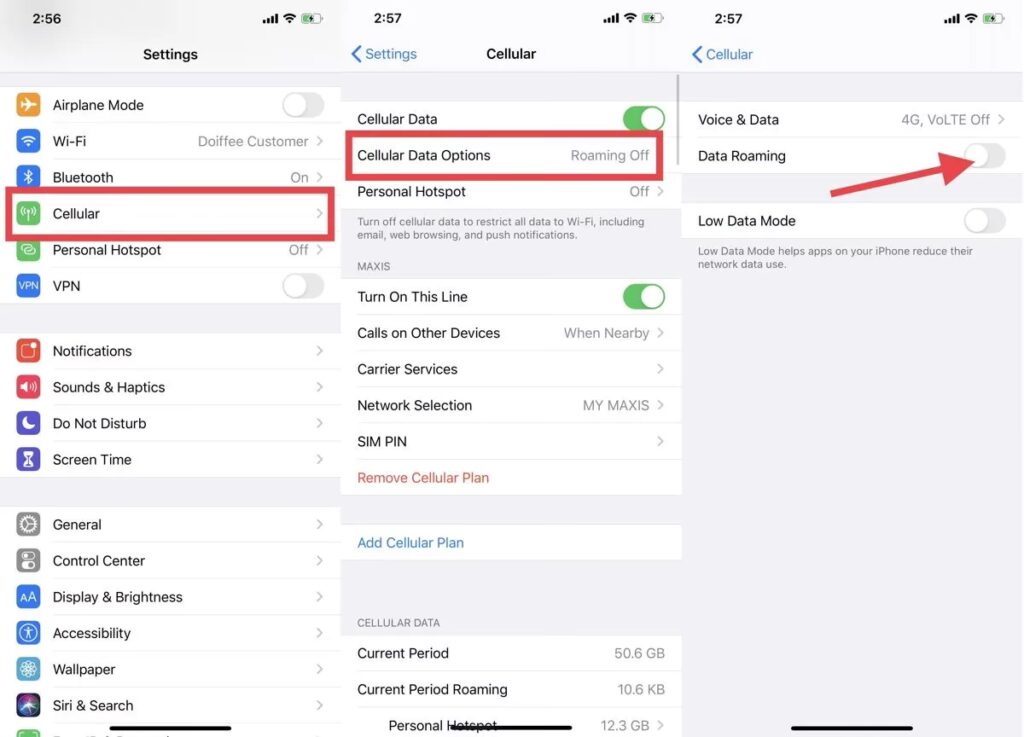 Specifically: If you have these roaming issues while traveling internationally, learn what to do: If you see No Service in the status bar of your iPhone, go to Settings > Cellular > Cellular Data Options and make sure that Data Roaming is on. Then contact your carrier to make sure that international roaming is turned on for your account.