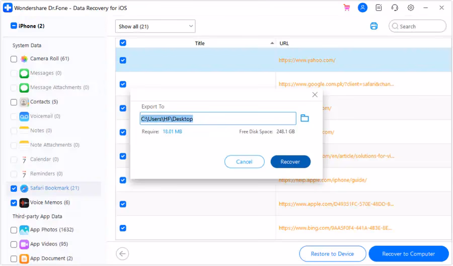 Dr.Fone také exceluje v práci se zálohami iTunes. Zatímco standardní obnova z iTunes zálohy vyžaduje úplné vymazání zařízení a následné nahrání celé zálohy (což může přepsat novější data, která na zařízení mezitím vznikla), Dr.Fone nabízí mnohem flexibilnější přístup: