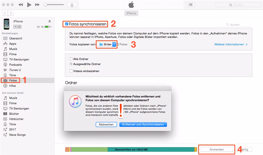 - Synchronizujte iPhone: V iTunes v pravém dolním rohu klikněte na tlačítko „Použít“ nebo „Synchronizovat“. iTunes poté odstraní z iPhonu ty fotky, které již nejsou v původní složce na vašem počítači, nebo všechny, pokud jste zrušili synchronizaci.