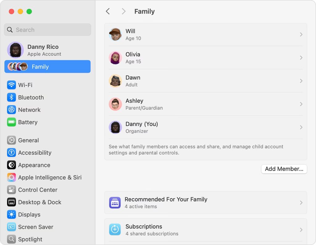 Pokud je dítě mladší 13 let (věk se může v různých zemích lišit), organizátor rodiny může jeho stávající Apple ID přidat do Rodinného sdílení a převzít nad ním kontrolu. Pokud je starší, může se připojit do Rodinného sdílení jako dospělý člen, ale rodičovské kontroly (Žádost o nákup, Klidový čas) musí být nastaveny a přijaty přímo na jeho zařízení.