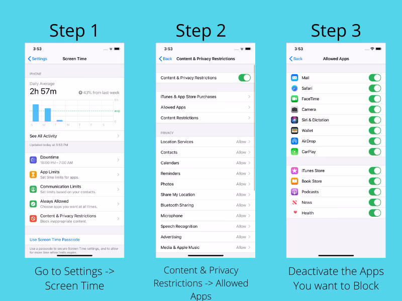 - Pro nastavení této funkce jednoduše otevřete aplikaci Nastavení a vyberte Čas u obrazovky → Omezení obsahu a soukromí → Povolené aplikace. Zde budete moci vybrat, které aplikace jsou povoleny nebo omezeny. Například, pokud chcete svému dítěti zabránit v přístupu k sociálním médiím, jako je Instagram nebo Snapchat, můžete tyto aplikace snadno omezit v otevírání na jeho telefonu.