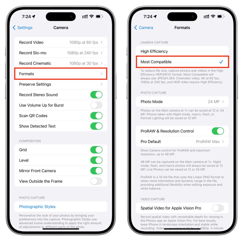 Po provedení této změny budou všechny nové fotografie pořízené vaším iPhonem ukládány ve formátu JPG, což výrazně zlepší jejich kompatibilitu s jinými zařízeními a softwarem. Mějte na paměti, že to může vést k rychlejšímu zaplňování úložiště vašeho telefonu, protože soubory JPG jsou větší než HEIC.
