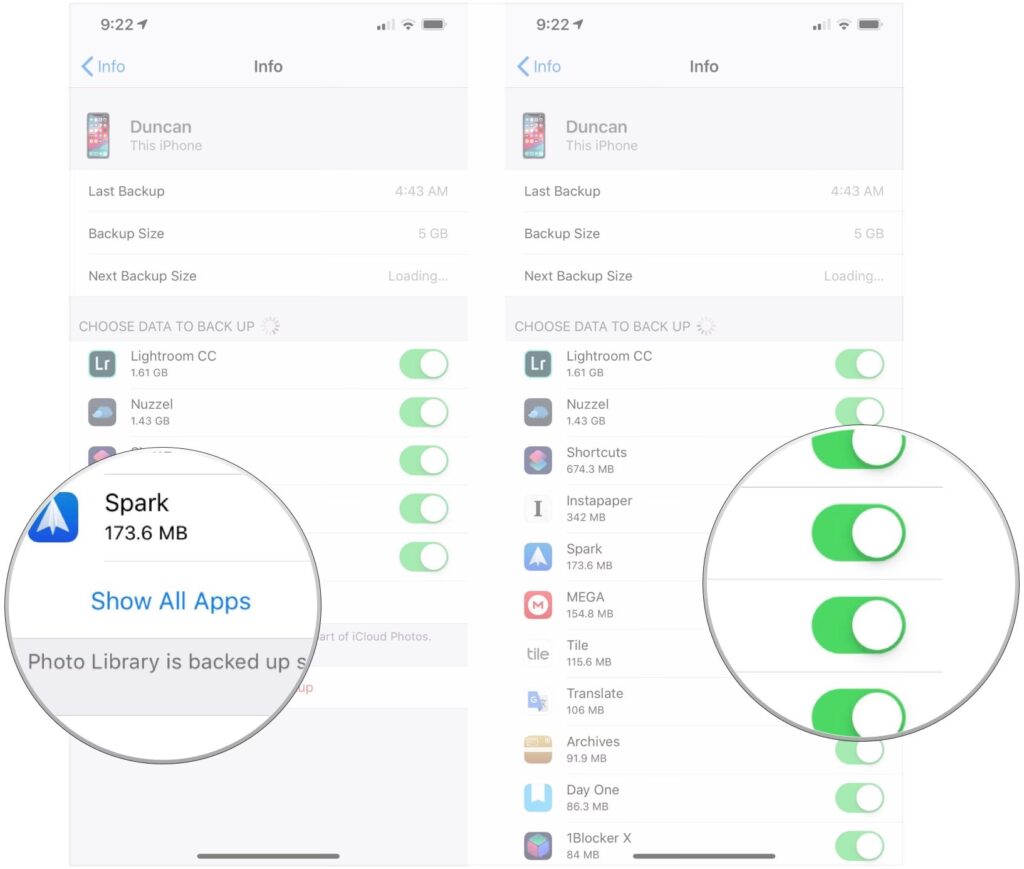 - Zvažte vypnutí aplikací, které nechcete zálohovat, abyste ušetřili místo.