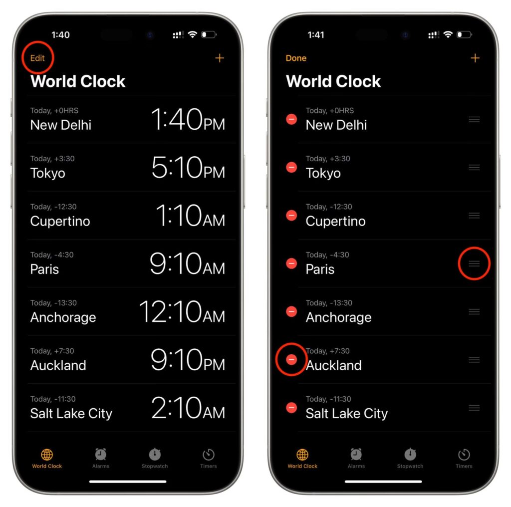 - Z aplikace Hodiny: Otevřete aplikaci „Hodiny“, přejděte na záložku „Světové hodiny“ a odstraňte sekundární město ze seznamu (viz výše uvedené kroky pro správu časových zón). Tím zajistíte, že žádné další město nebude sloužit jako zdroj pro widget.
