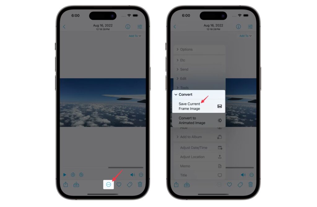 Po instalaci této bezplatné aplikace jednoduše vyberte video z knihovny Fotky vašeho iPhonu, pozastavte jej nebo přetáhněte posuvník, abyste našli správný snímek, a poté klepněte na tlačítko sdílení, abyste jej odeslali na sociální média nebo uložili jako fotografii. K dispozici je několik možností pro formát a metadata, ale aplikace je velmi čistá a přímočará při plnění úkolu.