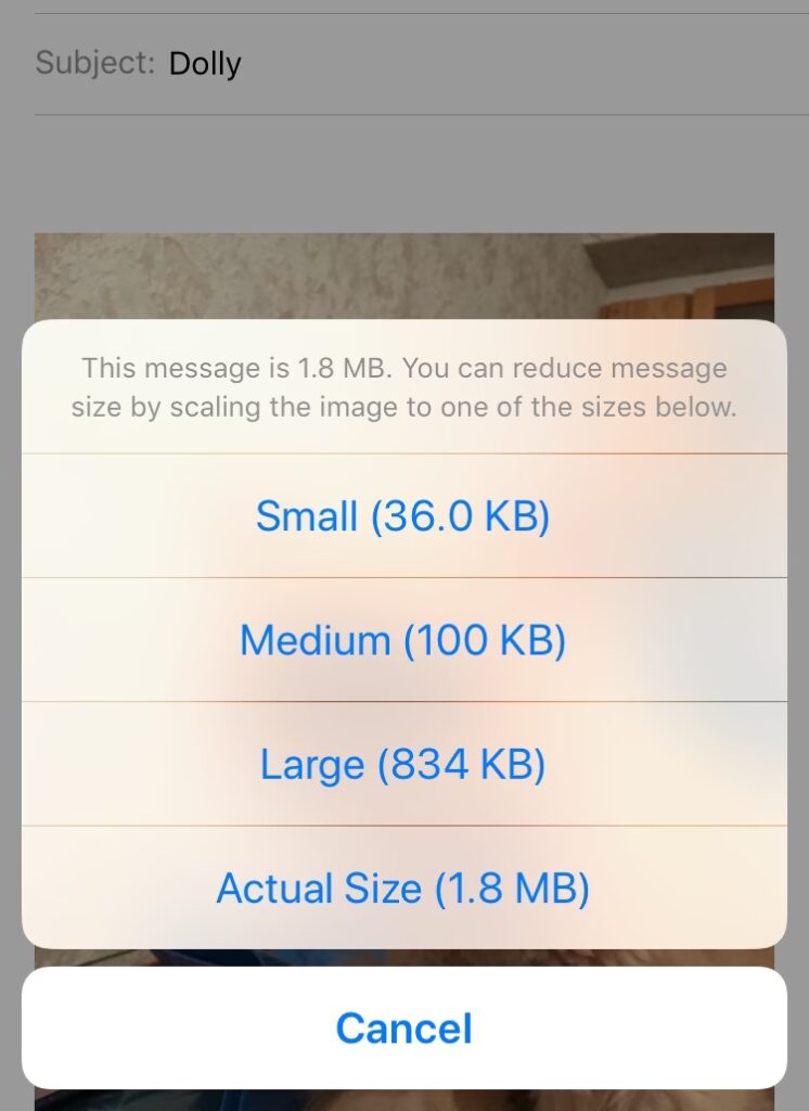 - Jakmile je e-mail odeslán, zobrazí se vám vyskakovací okno s možnostmi velikosti: