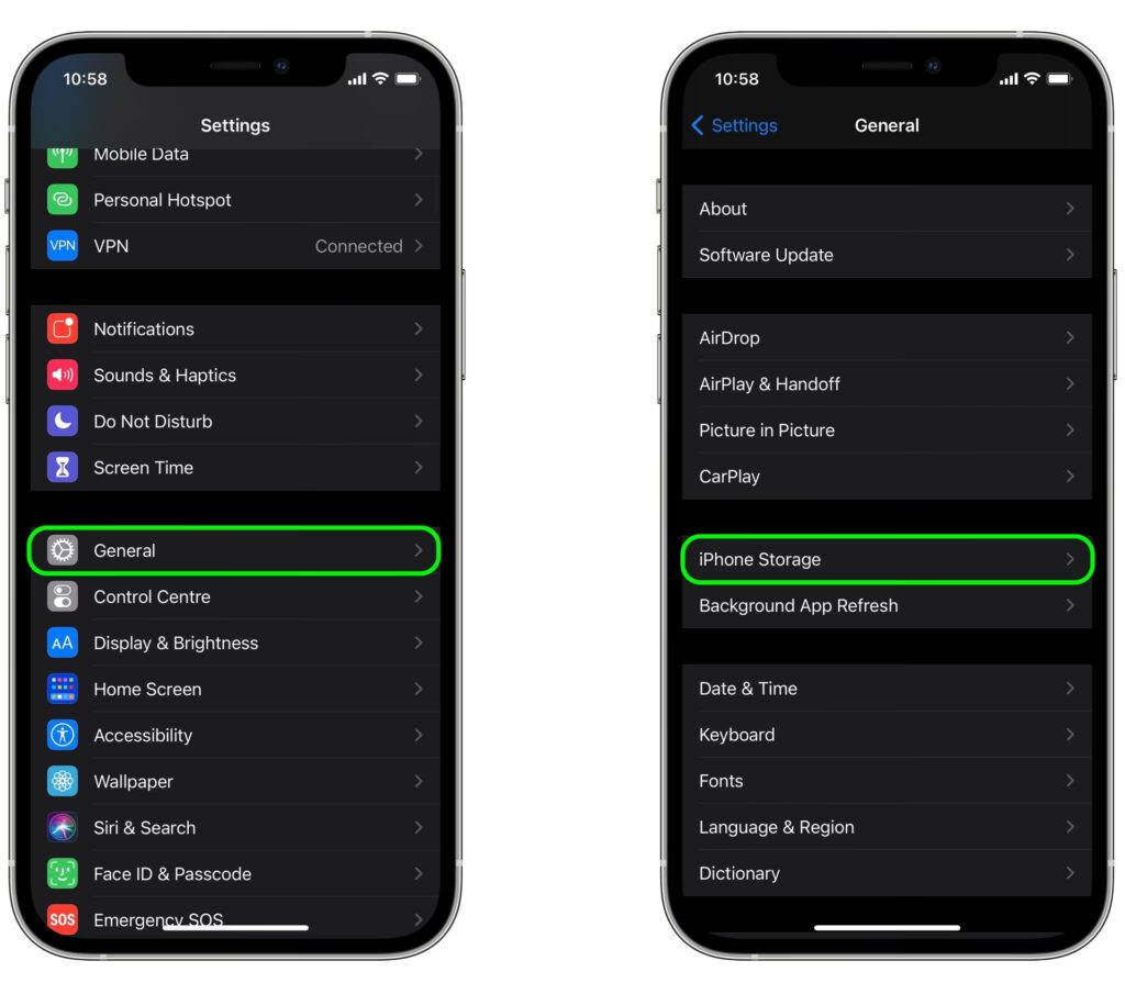 - Přejděte na Obecné (General) a poté na Úložiště iPhonu (iPhone Storage).