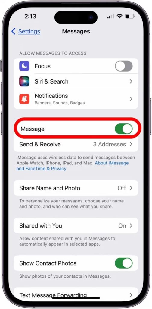 - Vypněte iMessage: Jděte do Nastavení > Zprávy a přepněte přepínač vedle „iMessage“ do polohy vypnuto (šedá barva).