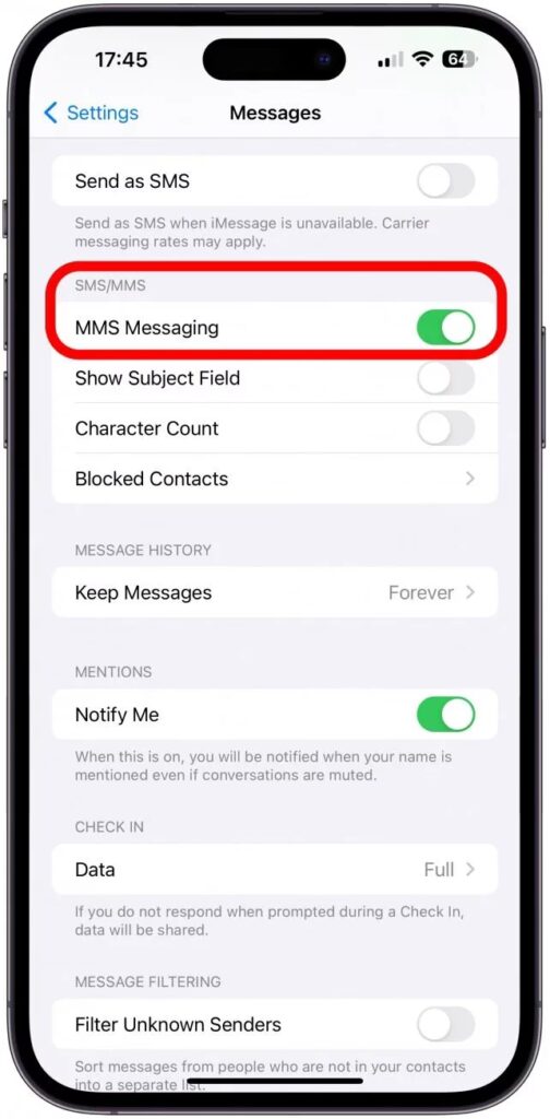 - Pokud není zapnuta, přepněte ji do polohy zapnuto. Poté zkuste znovu odeslat obrázek prostřednictvím textové zprávy.