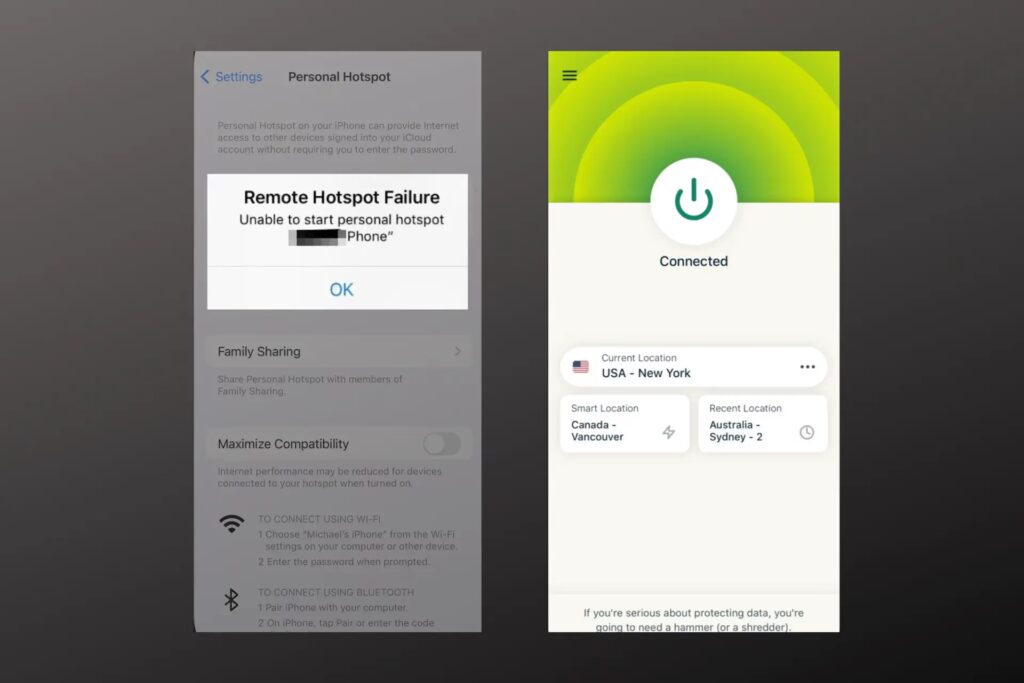 - Restartujte aplikaci VPN a síťová zařízení: Někdy stačí jednoduchý restart. Zavřete a znovu otevřete aplikaci VPN na iPhonu. Odpojte Mac od hotspotu a znovu se připojte. Zkuste také restartovat iPhone i Mac.