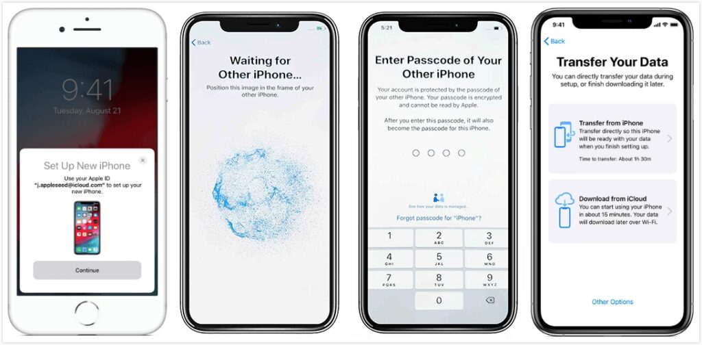 - Následně se vám nabídne možnost přenést data přímo z druhého iPhonu nebo obnovit ze zálohy na iCloudu či z počítače.