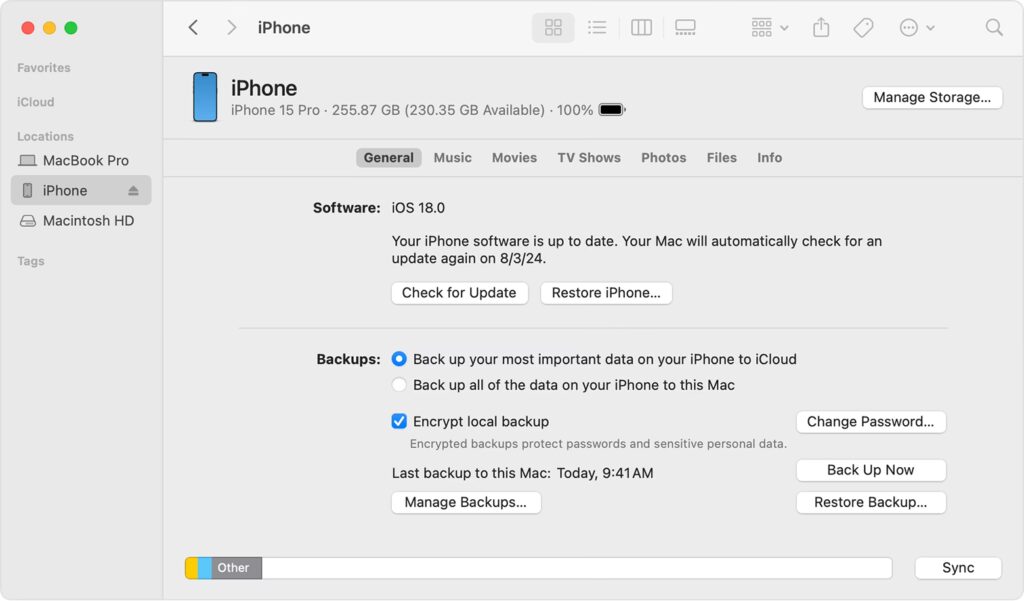 - V sekci 'Zálohy' (Backups) klikněte na Zálohovat nyní (Back Up Now), abyste vytvořili nejaktuálnější zálohu na svém počítači. Doporučuje se zašifrovat zálohu (nastavit heslo), aby se zálohovala i data jako hesla k Wi-Fi nebo data o zdraví.